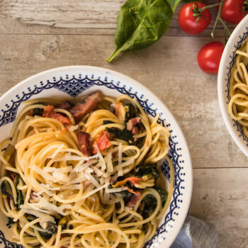 - Das Nudelwasser aufsetzen, salzen und die Spaghetti nach Anleitung ca. 8 Minuten kochen. Parallel etwas Olivenöl im Wok erhitzen und den Pancetta darin auslassen.